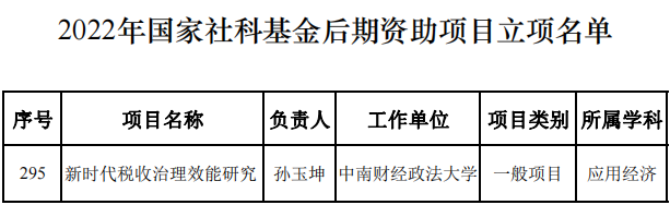 11月29日下午,全国哲学社会科学工作办公室官网发布了《2022年度国家社科基金后期资助暨优秀博士论文出版项目立项名单公示》,澳门永利官网孙玉坤老师研究的课题“新时代税收治理效能研究”获得一般项目立项。